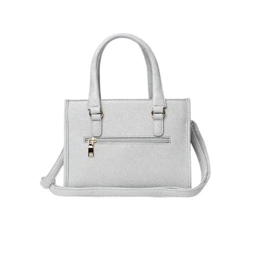 The Peach And Pockets Gray Boxy Satchel Handbag is made from faux leather for everyday use. It has a main compartment with interior pockets for organization. The bag features a zipper closure, gold-colored fittings, and protective feet. A detachable and adjustable strap allows it to be carried by hand or on the shoulder.